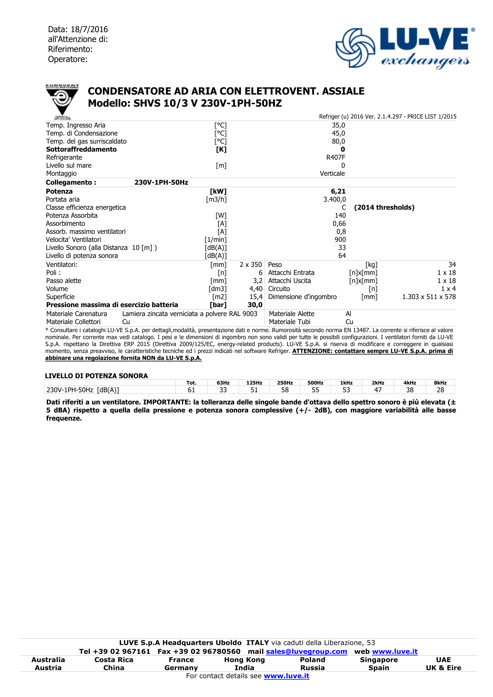 Informations sur le produit "CONDENSATEUR AIR LUVE SHVS 10/3 V VENTIL. 230V Super Hitec Ventilé Silencieux/ Installation verticale"